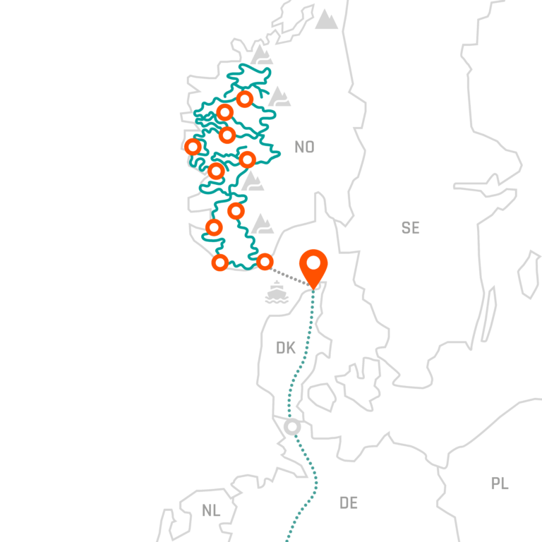 De route neemt je mee over kronkelende paswegen die steil omhoog slingeren vanaf de fjorden, naar uitgestrekte hoogvlakten. Je daalt af naar de Geirangerfjord, die op de UNESCO Werelderfgoedlijst staat, en geniet van de uitzichten. De Dalsnibba biedt je een panoramisch uitzicht over de fjord vanaf een van de hoogste punten. Onderweg rijd je langs iconen zoals de Trollstigen, met zijn beroemde haarspeldbochten, en de Orneveien, de adembenemende “Adelaarsweg”. Ook het majestueuze Jostedalsbreen, Europa’s grootste gletsjer, en het schilderachtige Urnes, waar je de oudste houten kerk van Noorwegen kunt bewonderen, staan op het programma.